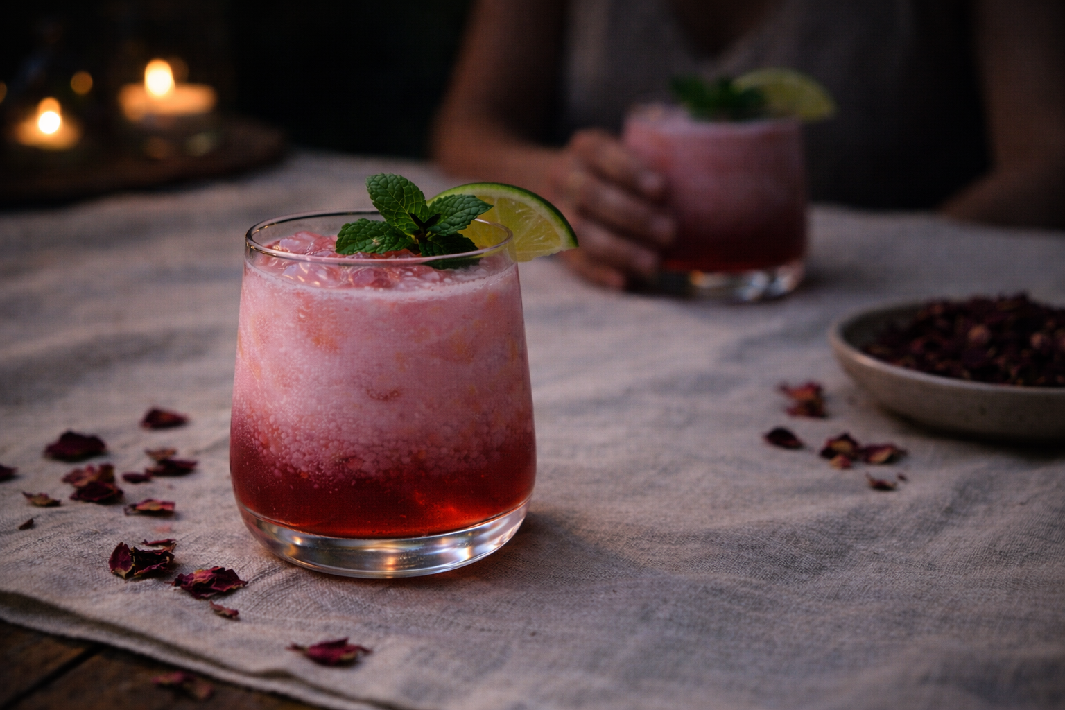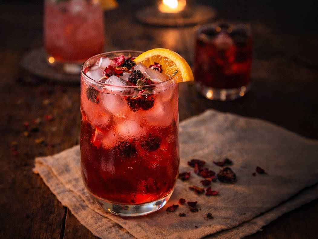 Bebida frutal sin alcohol , con hibiscus, rosas y frutos rojos (receta para 2 personas)
