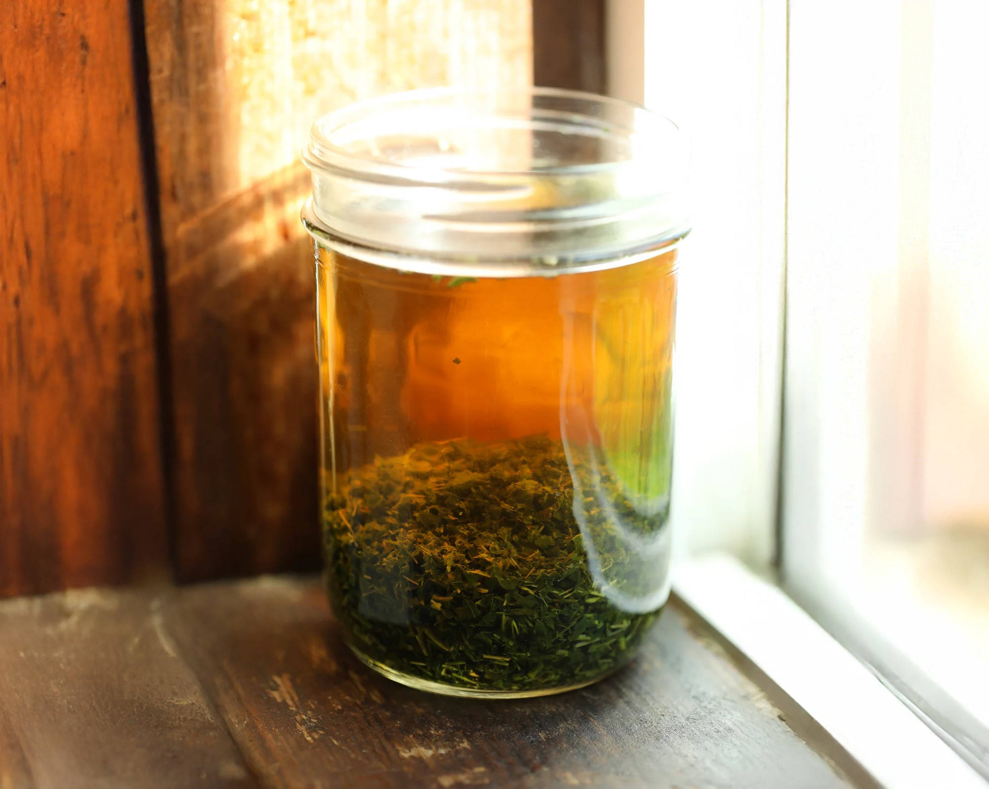 Tapá el frasco y guardalo en un lugar fresco y oscuro, bien cerrado por 3 días. Agitar ocasionalmente para que se integren las hierbas.